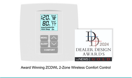 While the thermostat controls the HVAC equipment, the ZCDWL 2-Zone Control automatically controls the distribution of heating and cooling to provide a uniformly comfortable home.